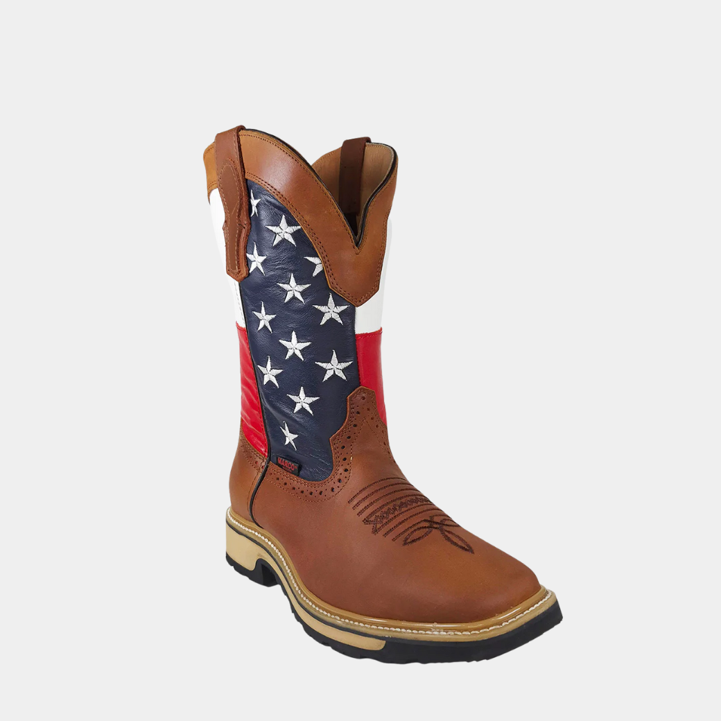 Las JP Work Boots® USA Tang combinan resistencia, estilo y un diseño patriótico inspirado en la bandera de Estados Unidos. Hechas a mano en León, México, están elaboradas en cuero premium color miel con un eje en tonos rojo, blanco y azul que aporta carácter y presencia única. La construcción de doble costura asegura máxima durabilidad, mientras la suela antideslizante ofrece tracción confiable en condiciones exigentes. Su punta cuadrada y tacón robusto brindan estabilidad en cada paso, y la plantilla acolchada garantiza comodidad durante toda la jornada. Una bota creada para hombres que buscan fuerza, identidad western y desempeño en el trabajo diario.